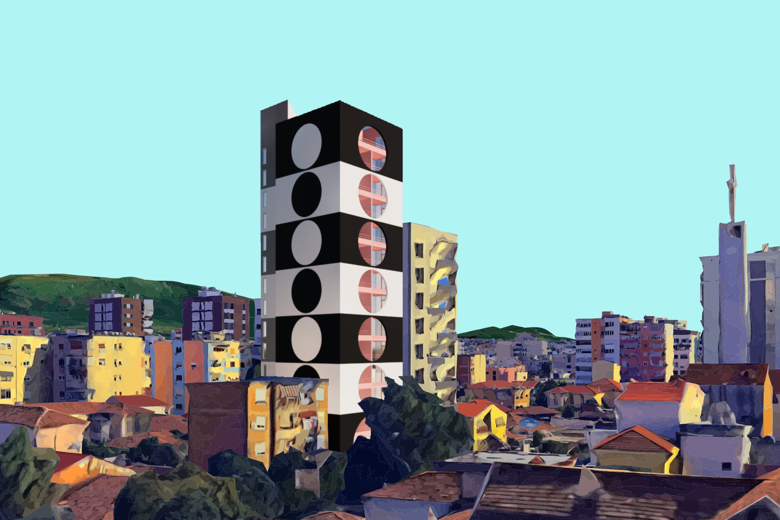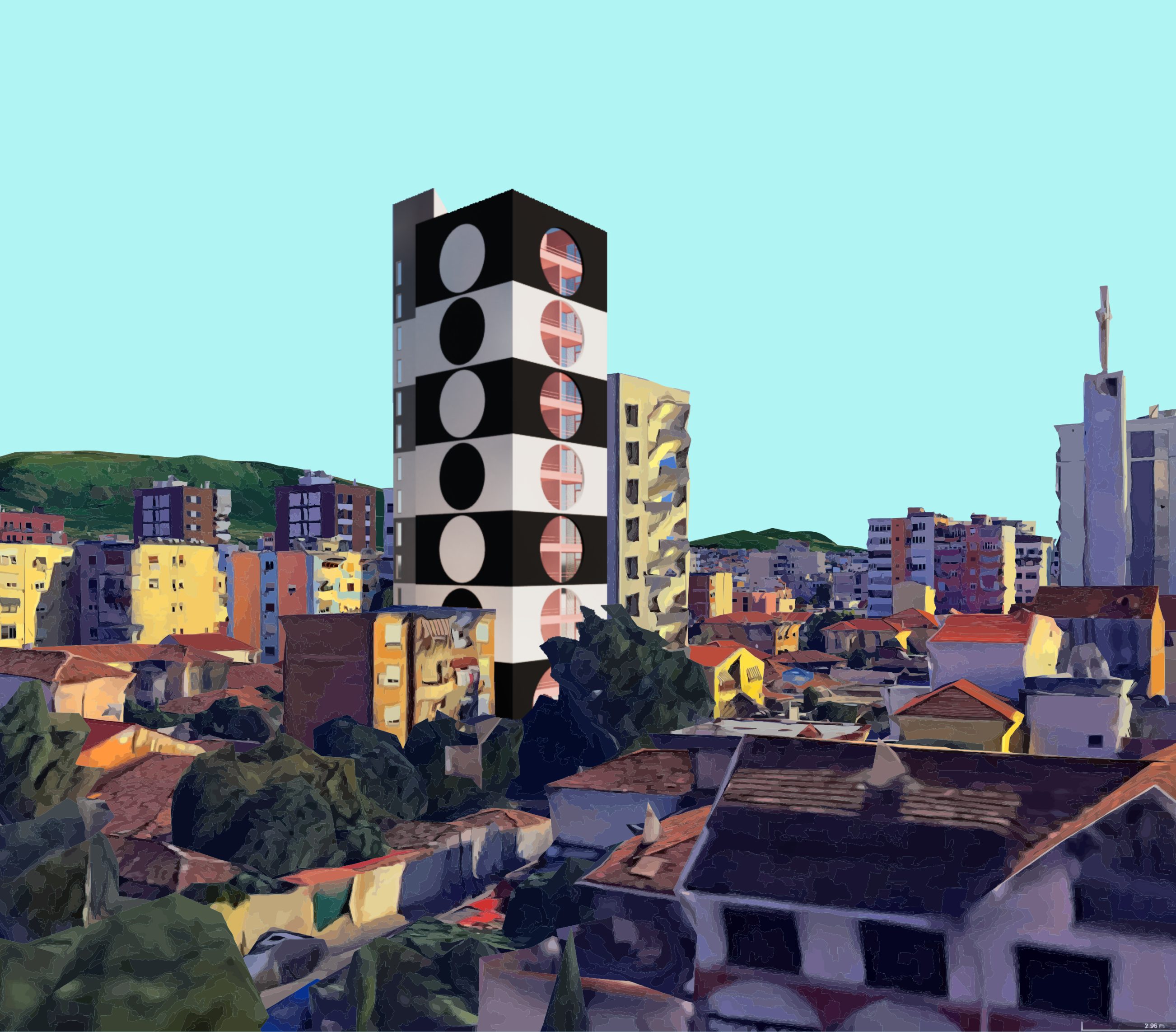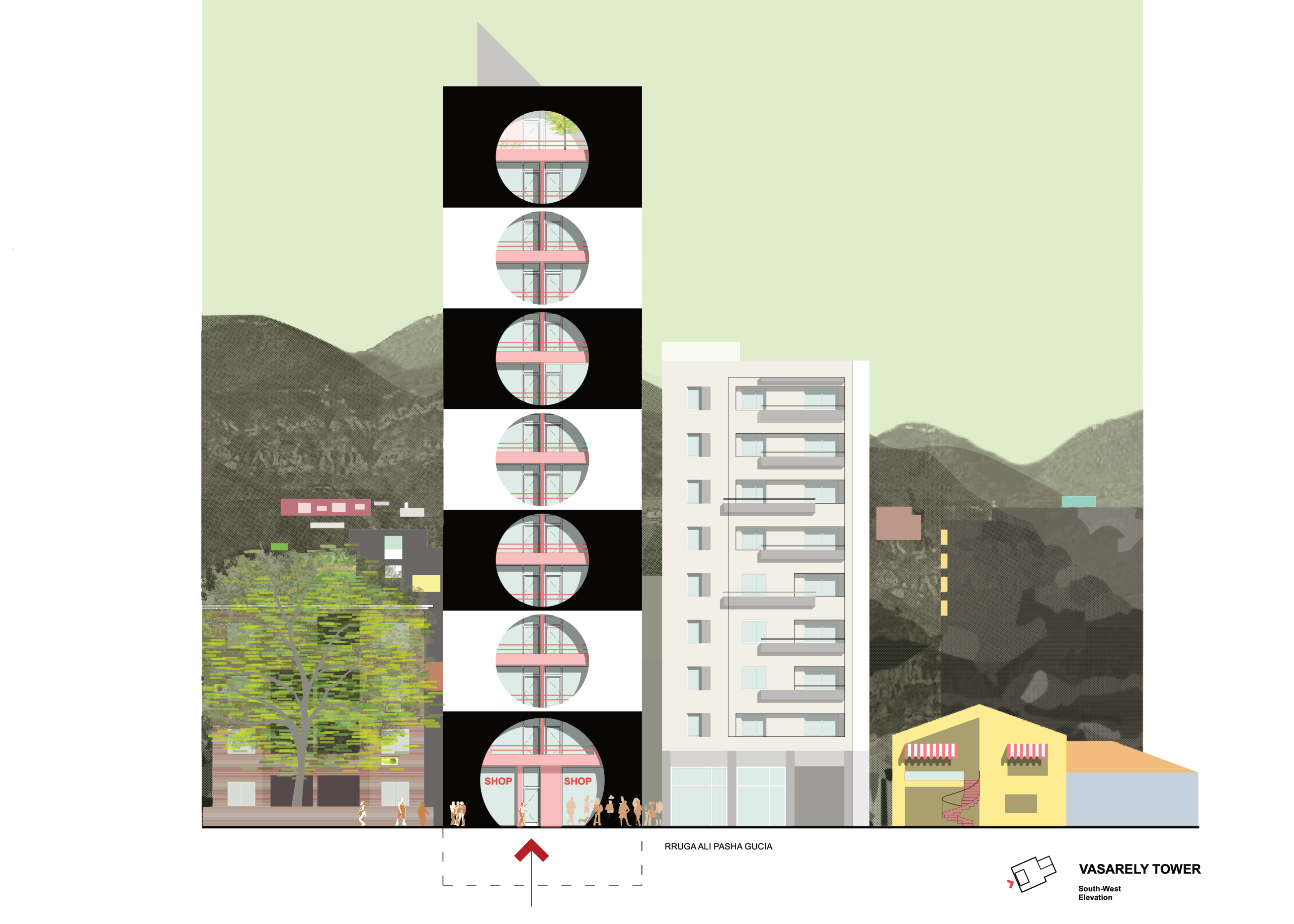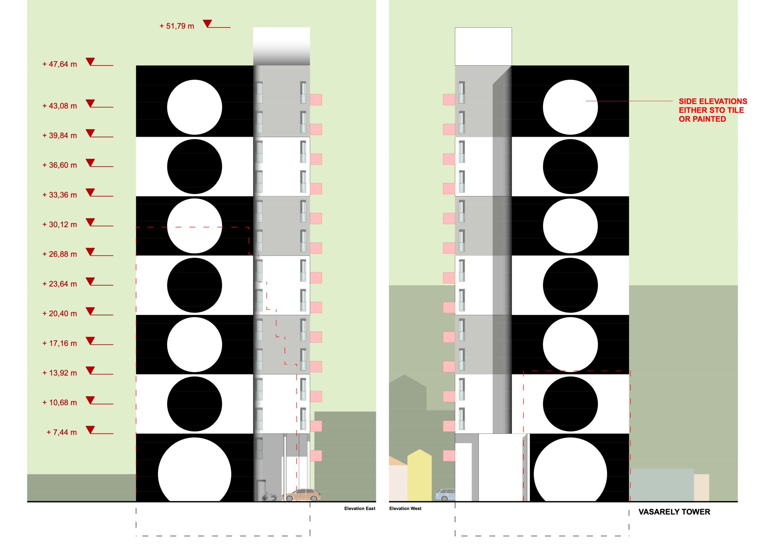 The theme of the Vasarely Tower design is derived from the hungarian pop artist Victor Vasarely who used simple geometric shapes and strong contrasting colours. The Vasarely Museum in Aixen-Provence interprets Vasarelys paintings as a building. For our proposal the horizontal museum becomes a vertical tower.